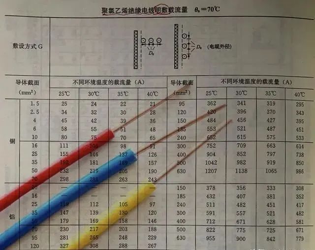 上图是聚氯乙烯绝缘聚氯乙烯护套电缆 明线安装载流量(数据来源于《供配电设计手册》)