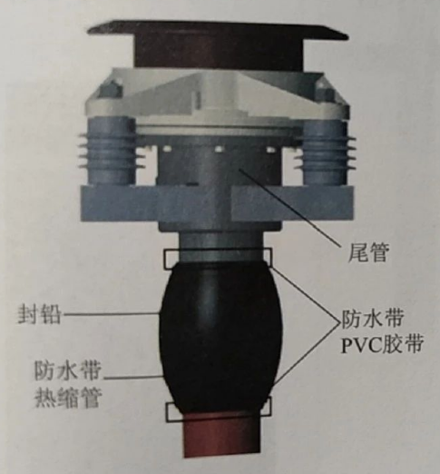 (7)在尾管的下沿处,分别半搭盖包绕二层自粘性丁基胶带,二层防水带和二层聚氯乙烯自粘带用作密封。